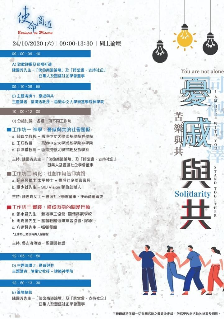 2020使命商道論壇主題「憂戚與共」,大會刻意地用上「憂戚」而非「休戚」就是為了表達當下香港社會被憂愁、悲哀吞噬的狀態。憂愁不只是因為個人的不幸,更是與他者的相互關係。