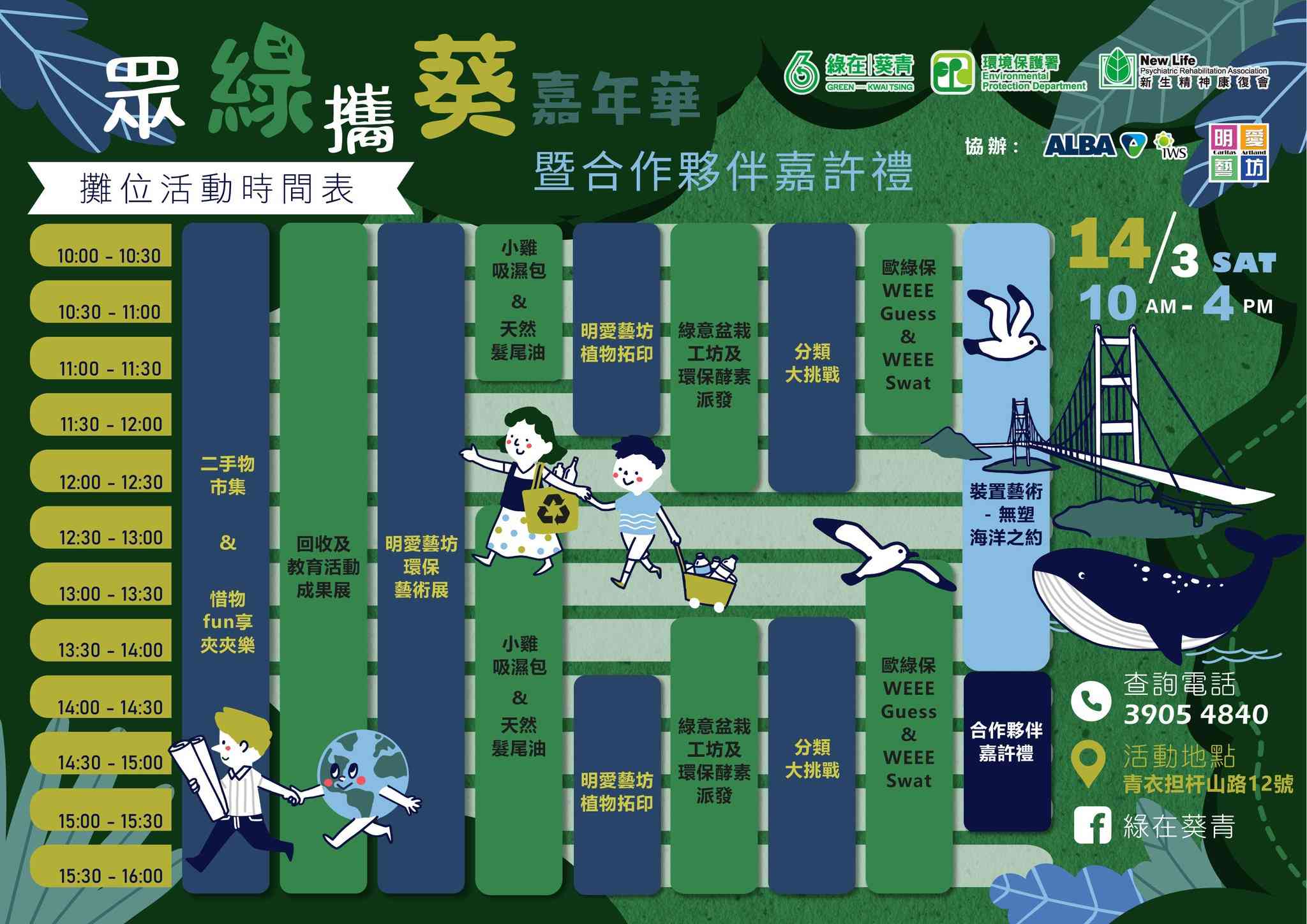 「眾綠攜葵嘉年華」邀請歐綠保以及明愛藝坊協辦,將會設置10個環保遊戲及工作坊攤位,同日亦會舉行綠在葵青合作夥伴嘉許禮以及展出鯨魚造型參與式環保藝術裝置 ,約定大家3月14日一齊來參加呢場節目豐富嘅綠色盛宴!