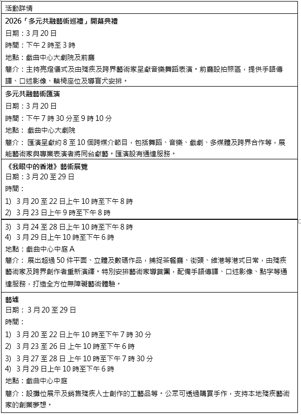 2026「多元共融藝術巡禮」開幕典禮將於 3 月 20 日下午在戲曲中心大劇院舉行,由殘疾及跨界音樂藝術家演出巡禮序曲,為一連串共融節目揭開序幕。