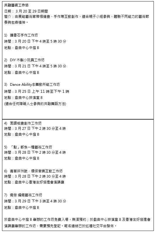 巡禮期間,戲曲中心將設有藝墟,展出及售賣由殘疾人士創作的工藝品及日常生活小物,讓公眾  在輕鬆的市集氛圍中,認識創作者背後的故事,支持共融創作。同場亦將舉行多場共融藝術工作坊,由展能藝術家及藝術導師帶領不同年齡層的參加者,以手作、音樂及舞蹈等形式,體驗「不一樣也可以一同參與」的創作過程,從互動中學習欣賞彼此的節奏與需要。公眾可透過親身參與,進一步了解藝術共融的意義。